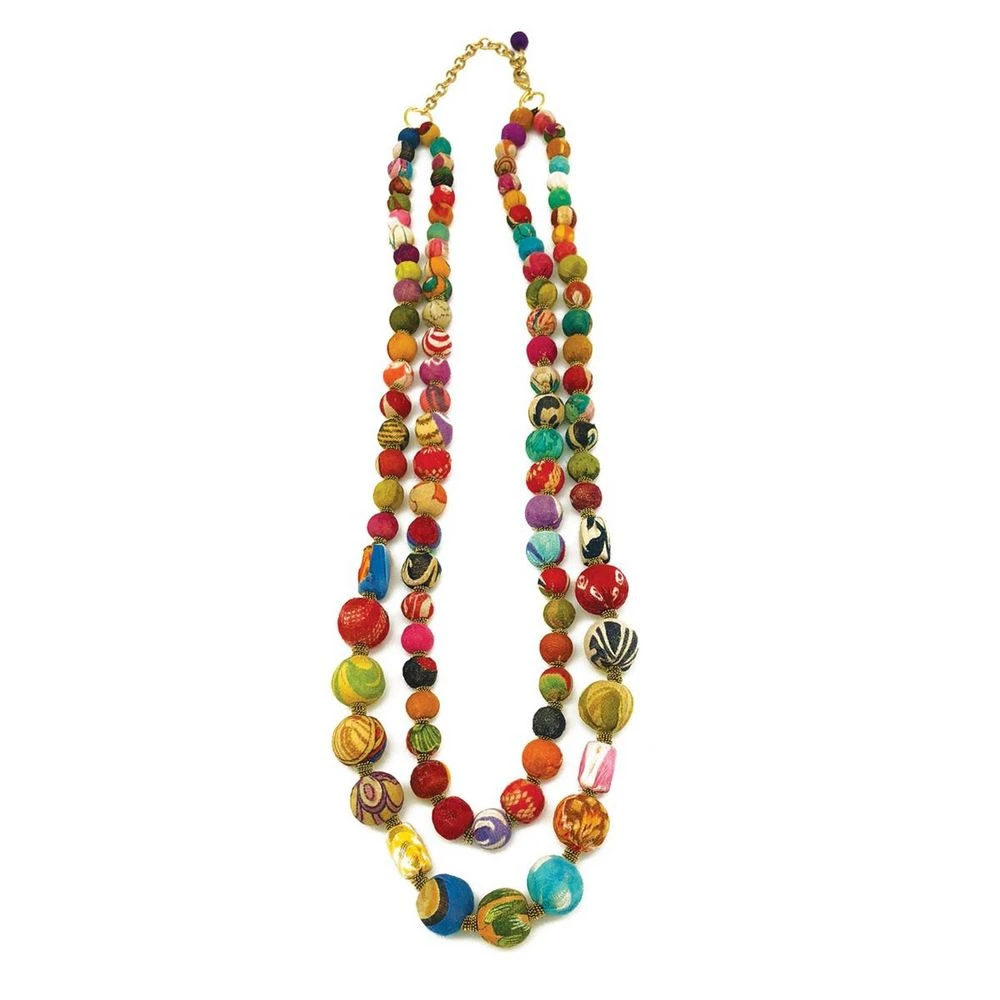 `Aasha` means hope in Hindi. Aasha is a 100% sustainable jewelry line made by an artisan group of economically disadvantaged women. Using discarded saris and wrapping them over small wooden beads these women are able to create a very unique and colorful collection of jewelry. The wooden beads are scraps sourced from furniture factories nearby, and the fabric used to cover them comes from old, worn saris, collected all over India. No two beads will be the same.