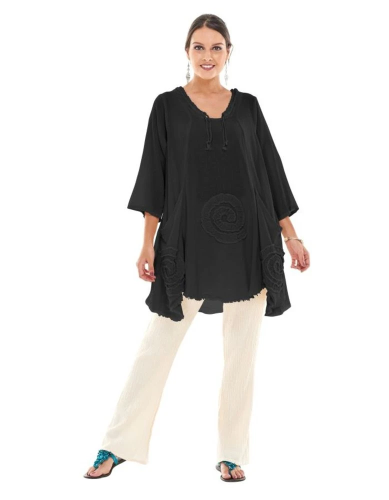 A flowy, fun top for any-day activities. Features three quarter length sleeves and two front pockets. A drawstring neckline and swirl stitch detail completes the look. Pair with flowy or tight pants.