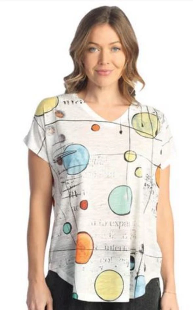 This abstract top features short sleeves and a v-neckline. Super lightweight fabric and a flowy fit. Pair with jeans or shorts.