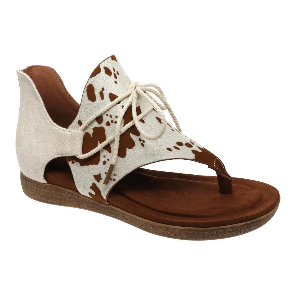 The Kori 11 is a beachy sandal with a faux suede fabrication and upper. Features include a short 1/2-inch platform, a back zipper, decorative rope tie, and toe thong design.