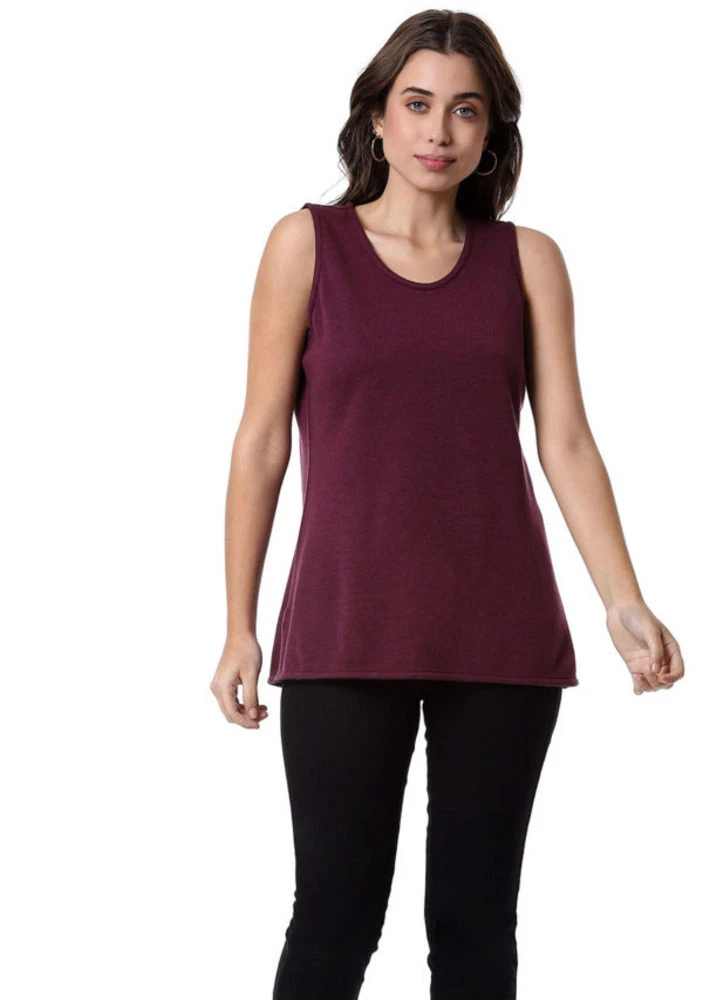 This simple tank can be layered or worn on its own on a warmer day. Features a sleeveless design and round neckline. Covers the backside and flatters your natural curves. Pair with pants, shorts, or a skirt.
