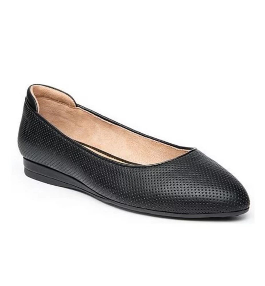 The adaria flat features a perforated leather upper and a memory foam footbed for all day comfort. Easy slip on style and narrow width. Slip them on for work or a night out.