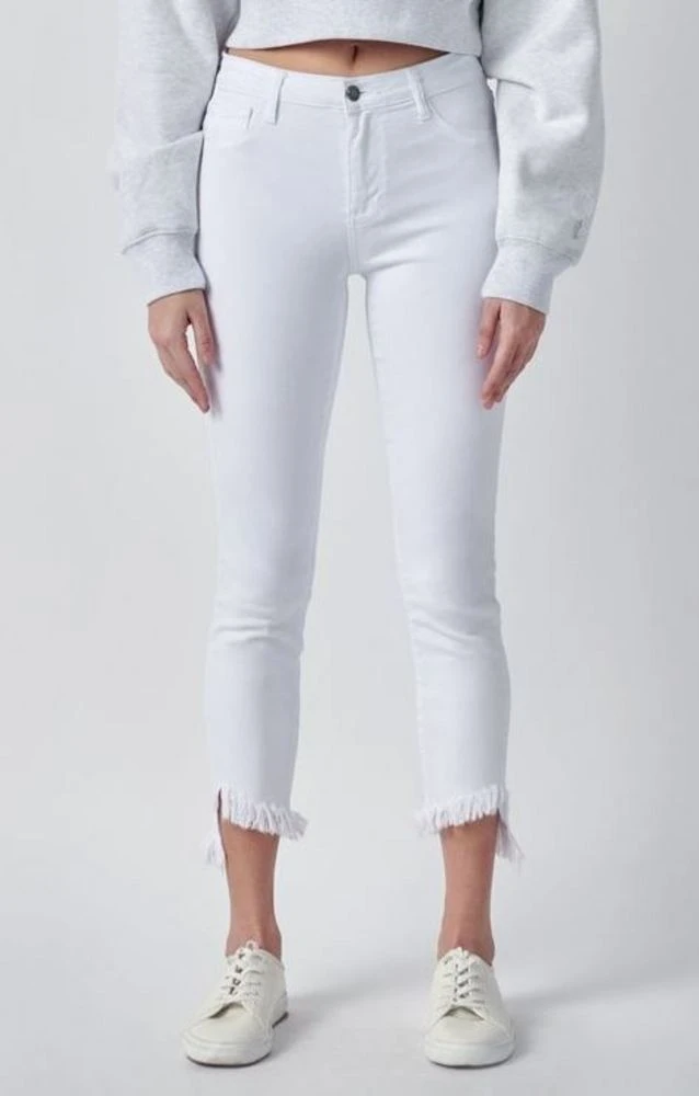 White jeans for the Spring and Summer. Features a frayed hem and five pocket design. Mid rise length wit a zip fly closure and belt loops. Comfy for all day wear and pairs well with anything from sneakers to heels. 55% cotton 43$ rayon 2% spandex
