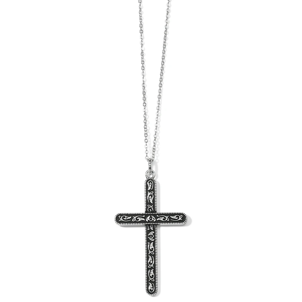 One side of this timeless cross necklace has Damascene art-inspired motifs that have amazing intricacy. Flip the pendant over for a simple silver design. Length: 18` – 38` Adjustable