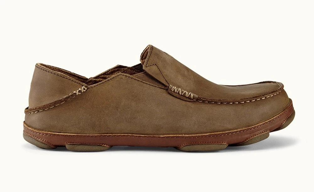 The Moloa is as easy as a slide and as secure as a shoe. Moloa means lazy, but maybe you are, and maybe you aren`t. The Moloa features a water resistant leather upper, a soft microfiber synthetic suede lining with Serdia® anti-microbial treatment, full grain leather foxing outsole with non-marking rubber traction pods, an anatomically correct contoured footbed, elastic gore on the vamp, and hand sewn whipstitching and embroidered logo. This Olukai has a versatile heel-stay that allows it to be worn as a shoe or a slide. Footbed is removable and washable.