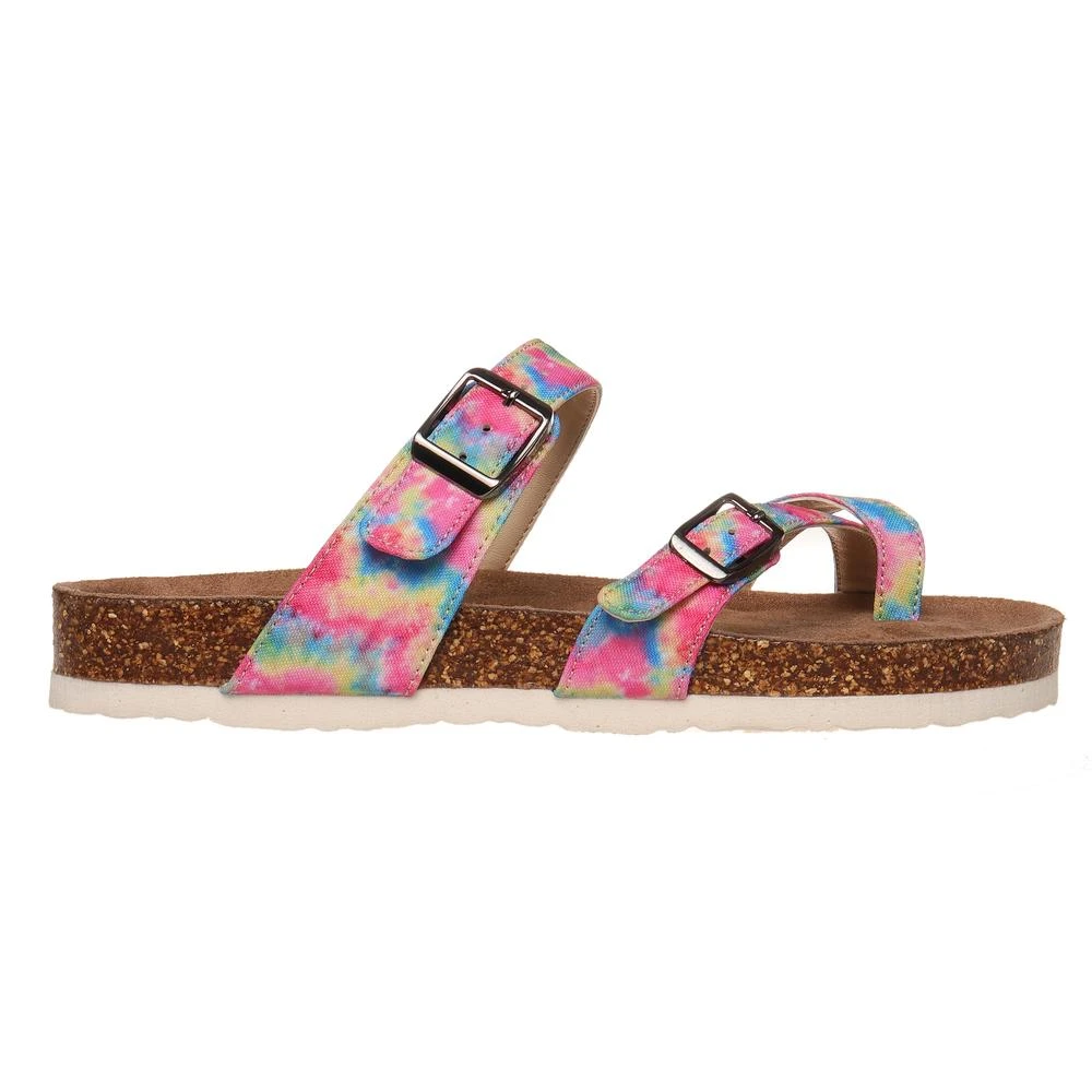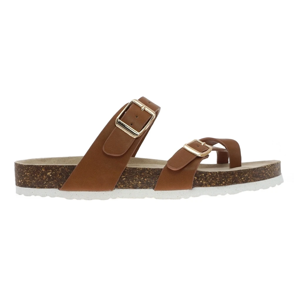 Summer sandals with a fun new twist. This Birkenstock style shoe with a faux suede or faux leather crossed upper pairs well with both jeans and dresses.