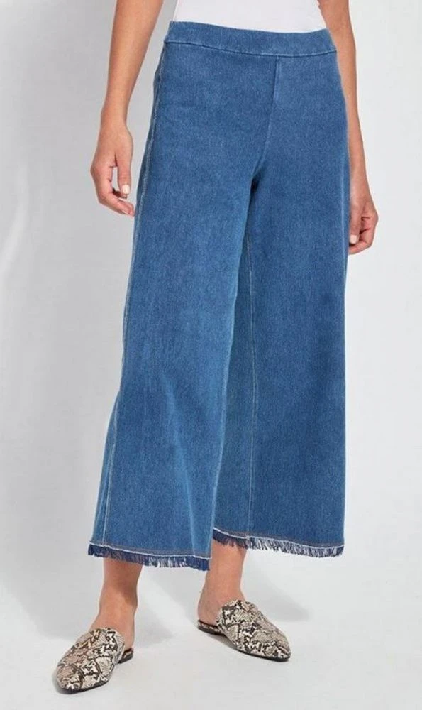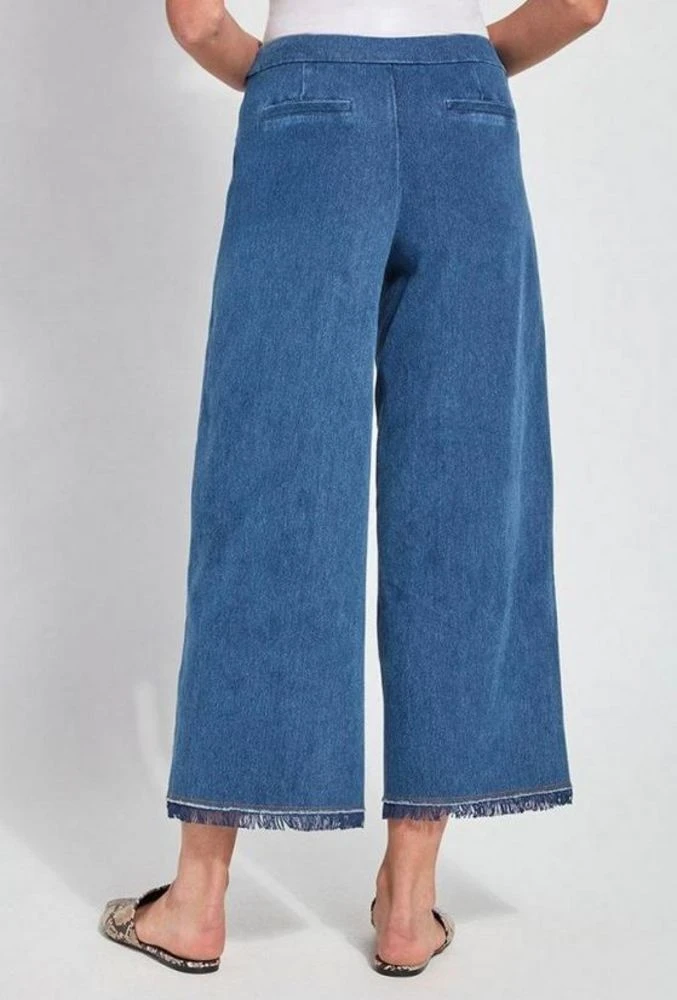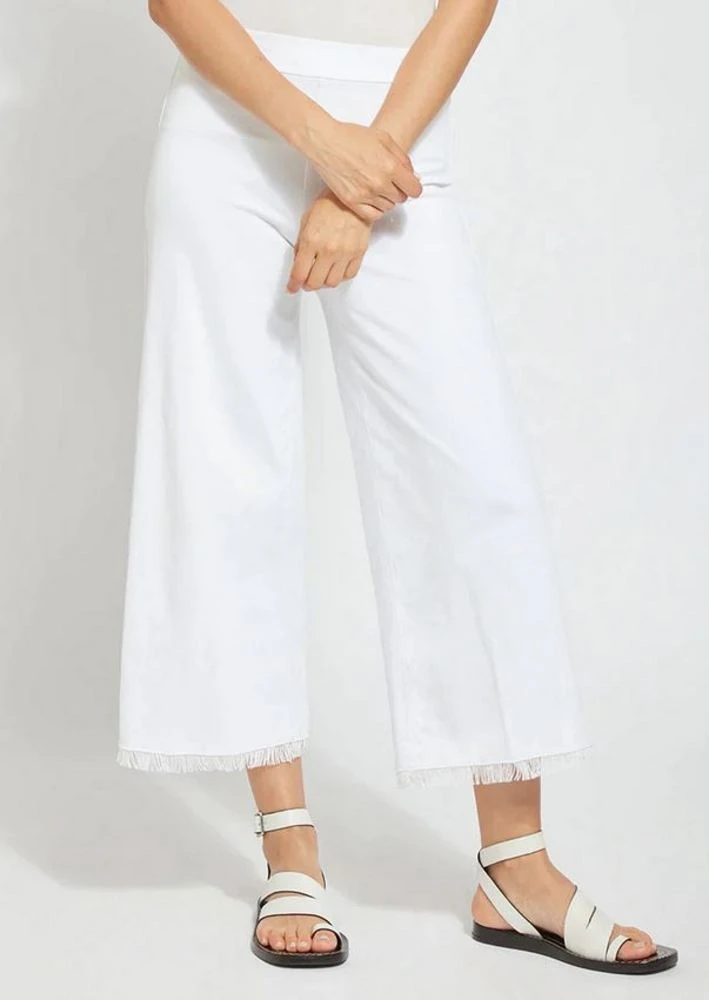 Laid back pants for a casual occasion. Features a slightly cropped design and fringed hem. Back welt pocked and a patented waistband. Easy pull on style with no button or zippers. Pair with a blouse or casual tunic. Fabric Content: 95% Cotton, 5% Elastane