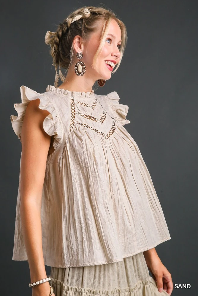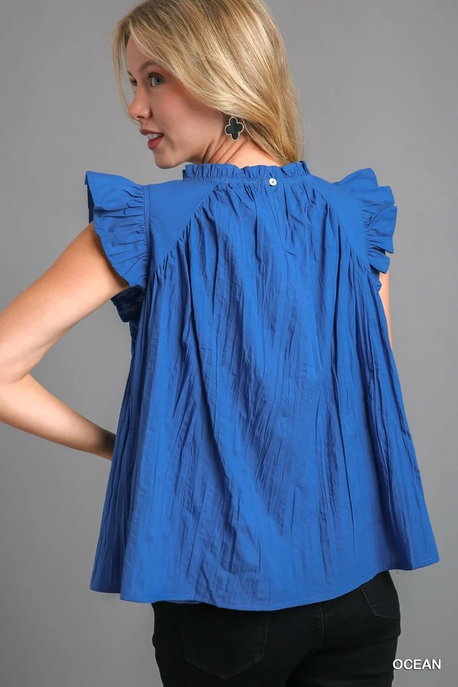 Fun and flirty in this poplin sleeve top. Features crinkle fabric and ruffle hem. A high neckline and flowy fit. Pair with shorts or tuck it into a maxi skirt. 100% Cotton