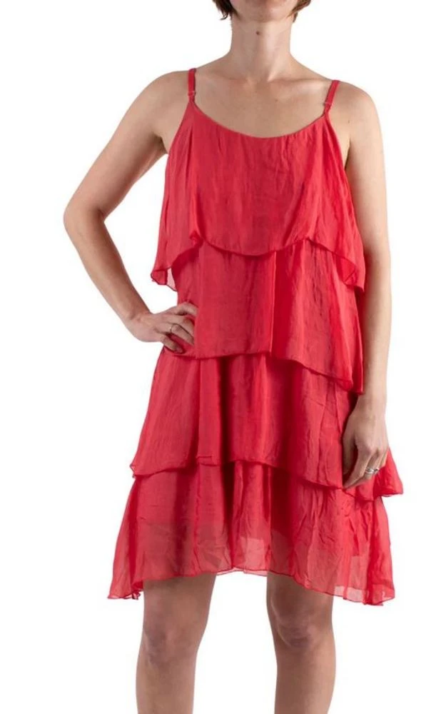 Throw on this ruffle silk dress for almost any occasion. Dress it up with heels or dress it down with sandals. Features adjustable spaghetti straps and a flirty, fun ruffle design. Exterior 100% Silk. Interior 95% Viscose, 5% Elastane. Made in Italy. One size.