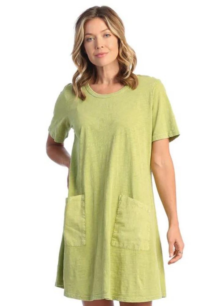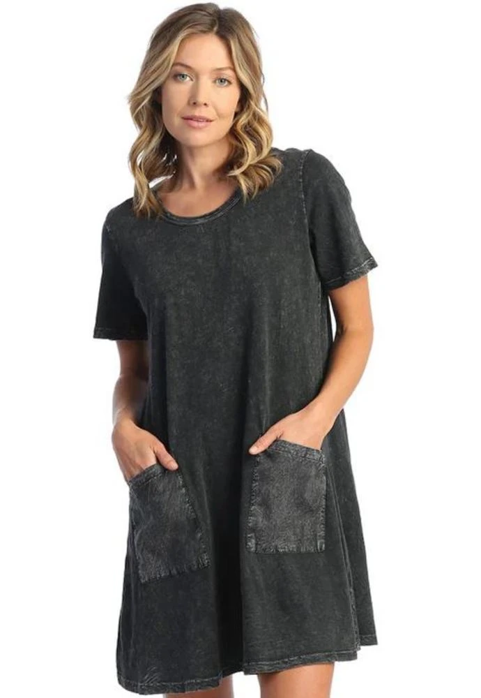 Super comfy for any day. This solid color dress features a round necklie and short sleeves. Two front pockets and a mineral washed 100% cotton fabric. Throw on some sandals and a sweater.