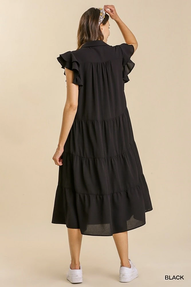 This stylish midi dress features a split collar neck and short ruffle sleeves. A tiered design and light, flowy fit will keep you cool all day long. Pair with sandals and a sun hat. 100% Polyester