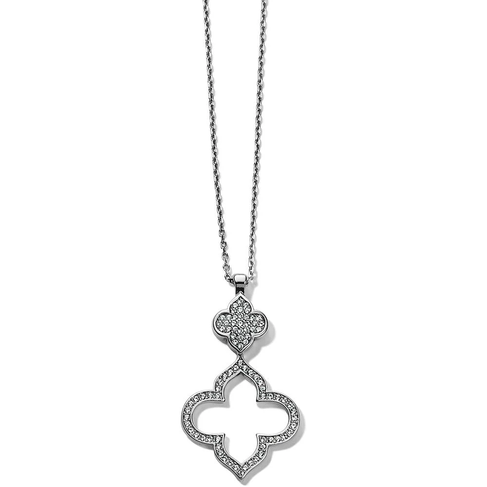 Two arabesques — one solid, one an outline — both shimmering with Swarovski, combine to form this elegant pendant. A simple chain easily adjusts to four different lengths. Length: 18` – 24` Adjustable