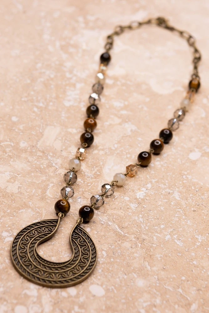 Natural stone beaded necklace with a u-shape pendant. Adjustable with lobster claw clasp.