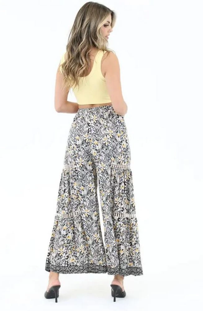 These feminine, wide leg pants featurese adorable lace details and a ruffle design. A comfortable elastic waistband for all day wear. Pair with a tank and some heels.