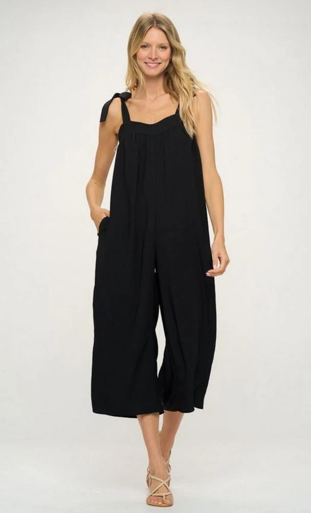 This light and flowy jumpsuit features a sleeveless design and tie straps. Sweetheart neckline and two side pockets for convenience. Pair with heels and sandals. 100% Polyester
